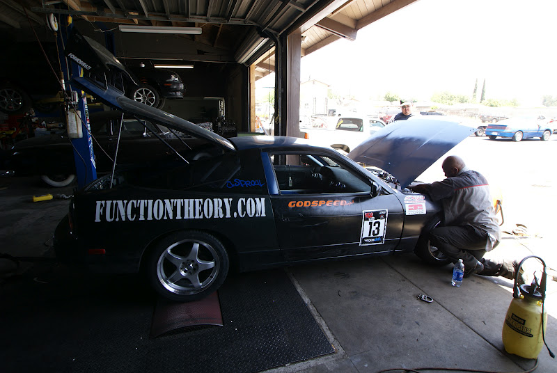 Yesterday was Rd 3 of the VegasDrift pro am series, and boy was it a hot one. With air temps around 105 degrees and ground temps over 150 degrees, lots of car were suffering. our own driver Joey Sproul was having his fair share of overheating issues. but with hood and bumper removed and a spray down after ever run we managed to keep the car cool, of course the N/A guys were not having as many temp issues as the turbo guys. it was a very exciting night with a few upsets, and also a few surprises. our driver Joey was having a great day with back to back to back consistent runs things were looking good for him with his new setup. but unfortunately was not able to put together a qualifying run. the event was a very laid back fun event with only 20 or so drivers singing up to compete and only the true enthusiast coming out despite the heat, made for a fun time. Starting off the top 16 introductions Brandon Wicknick's car caught fire after the ever popular hooning that takes places after all drivers are introduced. I am not sure hat caused this or what damage had actually been done, he was able to get reinspected and allowed to go on to participate in the top 16. his day was full of problems after braking a tranny and swapping it out during the hottest part of the day just to make practice before qualifying, and then it broke again only allowing him to have 1st and 2nd gear. The number 2 qualifier might have let his nerves get to him, allowing him to spin in both runs after a one more time, and just like that Spike Chen was out.POW put on a great show making it to the top four, but blowing his motor on the his wining run to take him into top 4. but as the night wore on and the battles for top 3 started to take place it became a very different mood, there was tension in the air after the battle for first and second with Forest Wang making a pass due to Alex Villabrialle taking a shallow line. after the decision was made there were some unhappy campers that believed it should have been a one more time battle, but with the judges call standing with a 2 for forest and 1 one more time, the night was over.